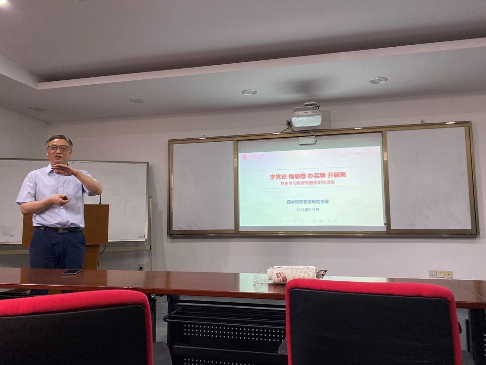 2021年9月9日中午,药物发现党支部在海角网 5号楼312会议室开展“学党史、悟思想、开新局”党史学习教育专题组织生活会。会议由支部书记刘德龙同志主持,支部全体党员参加活动,院党委副书记叶定剑同志到会并讲话。