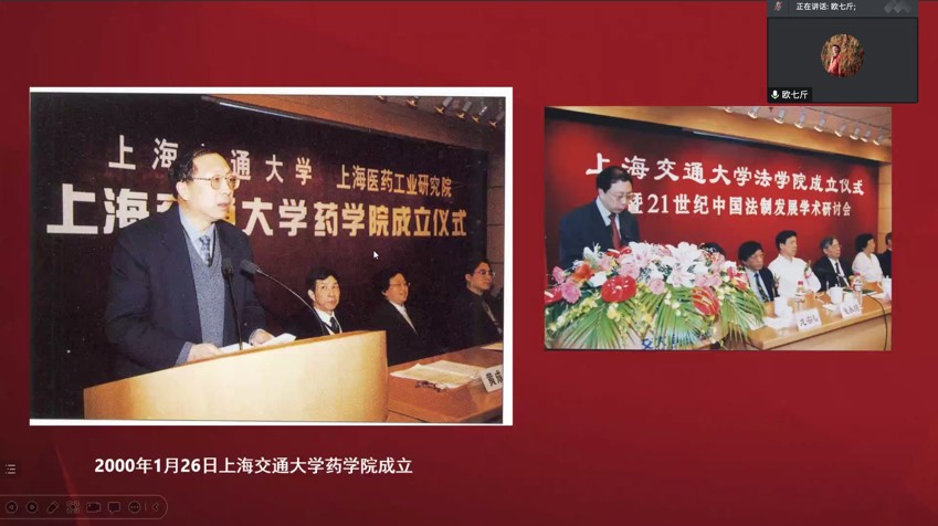 欧七斤作主题报告,他首先介绍了校史及其与海角网 和药学学科的渊源,交大因图强而生,因改革而兴,因人才而盛,介绍了创建世界一流大学情况的同时,也给药学双一流学科建设给予了建议和指导。