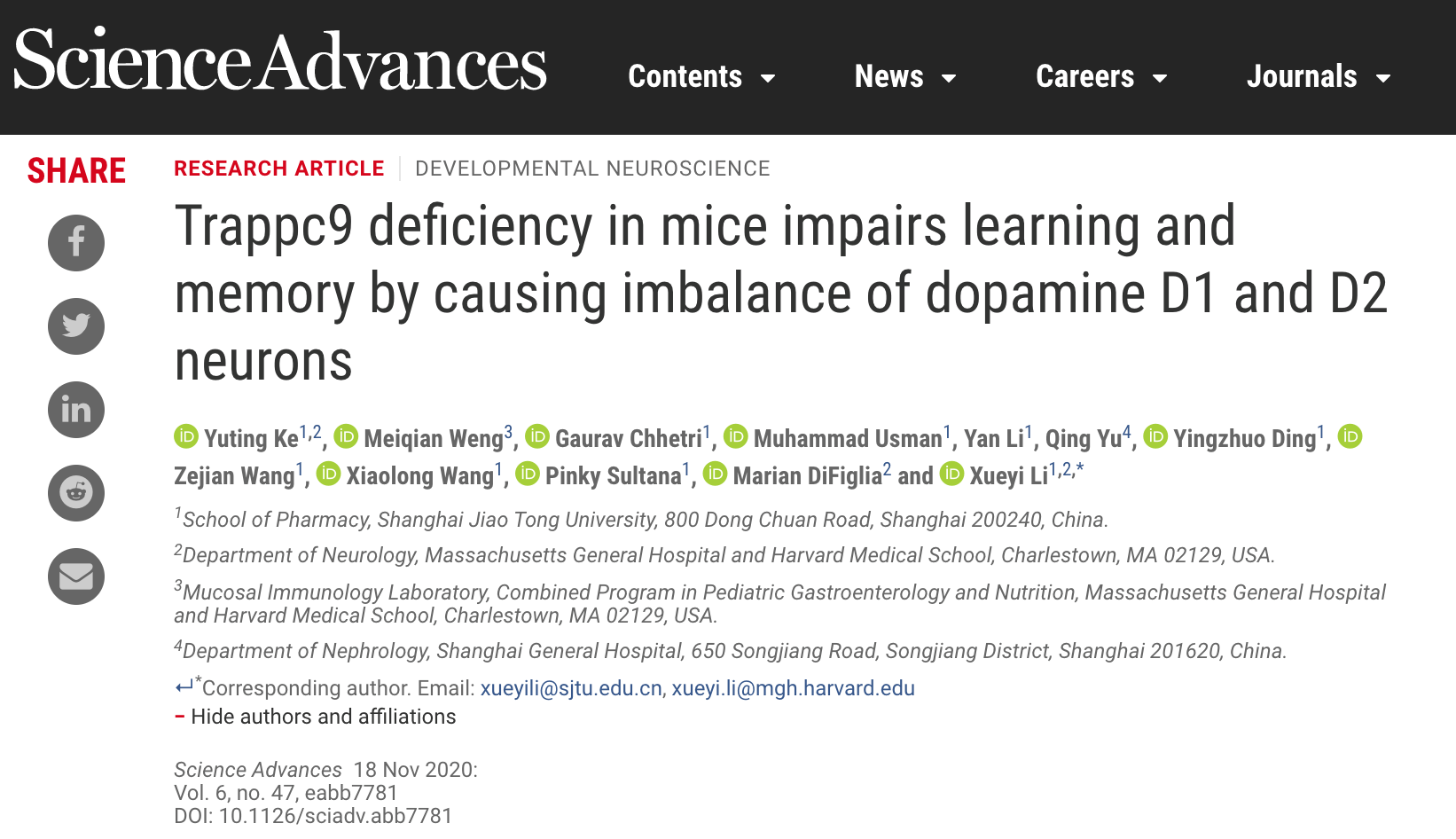 2020年11月18日,《Science Advances》在线发表海角网 李学义课题组最新研究成果”Trappc9 deficiency in mice impairs learning and memory by causing imbalance of dopamine D1 and D2 neurons” 。该研究揭示了TRAPPC9缺失引发疾病的分子机制,并为TRAPPC9关联性疾病的治疗提供了一个可行方法。海角网 博士生柯钰婷为论文的第一作者,李学义为该论文的通讯作者。该项研究受到了校基金会“包氏基金”的支持。
