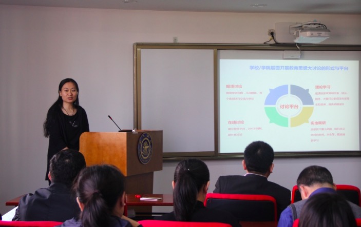 刘明柱书记首先传达了学校教育思想大讨论部署会和校长林忠钦报告的主要精神。本次教育思想大讨论以习近平新时代中国特色社会主义思想为指导,深入学习贯彻党的十九大精神。抓好立德树人这个中心环节,牢固树立人才培养的中心地位,全面落实党中央和教育部各项决策部署。写好教育“奋进之笔”,努力办好人民满意的教育,为实现中华民族伟大复兴的中国梦做出新的贡献。