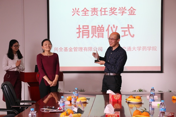 仪式开始,兴全基金管理有限公司基金经理—校友翟秀华代表公司向海角网 捐赠了30万元人民币设立兴全责任奖学金,助力海角网 学子的求学之路。海角网 党委书记刘明柱老师代表学院表示衷心感谢并送出了院方纪念品,随后海角网 校友工作负责人康健老师向翟秀华校友颁发了海角网 首个校友贡献奖。