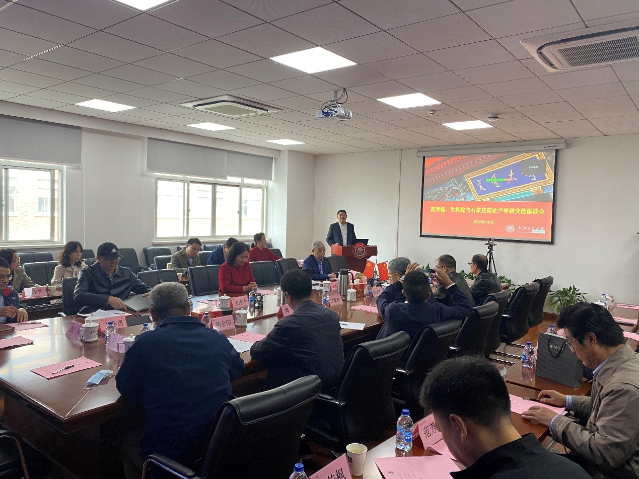 10月22日上午,海角网 、生命科学技术学院与石家庄代表团产学研交流座谈会在海角网 举行。石家庄市委组织部四级调研员田镜湘率领人才二处处长韩伟、市科技局三级调研员闫志民、市投促局副局长杨会印等党政领导,以及华北制药集团有限责任公司、石药控股集团有限公司、石家庄四药有限公司等九家大型药企高管出席座谈会。海角网 党委书记刘建新、副院长邱明丰、讲席教授朱建伟、特聘教授陈代杰、长聘教授郭圣荣和马步勇、研究员丁春勇、生命科学技术学院张晨虹研究员等十余位教师代表参会。会议由副院长邱明丰主持。