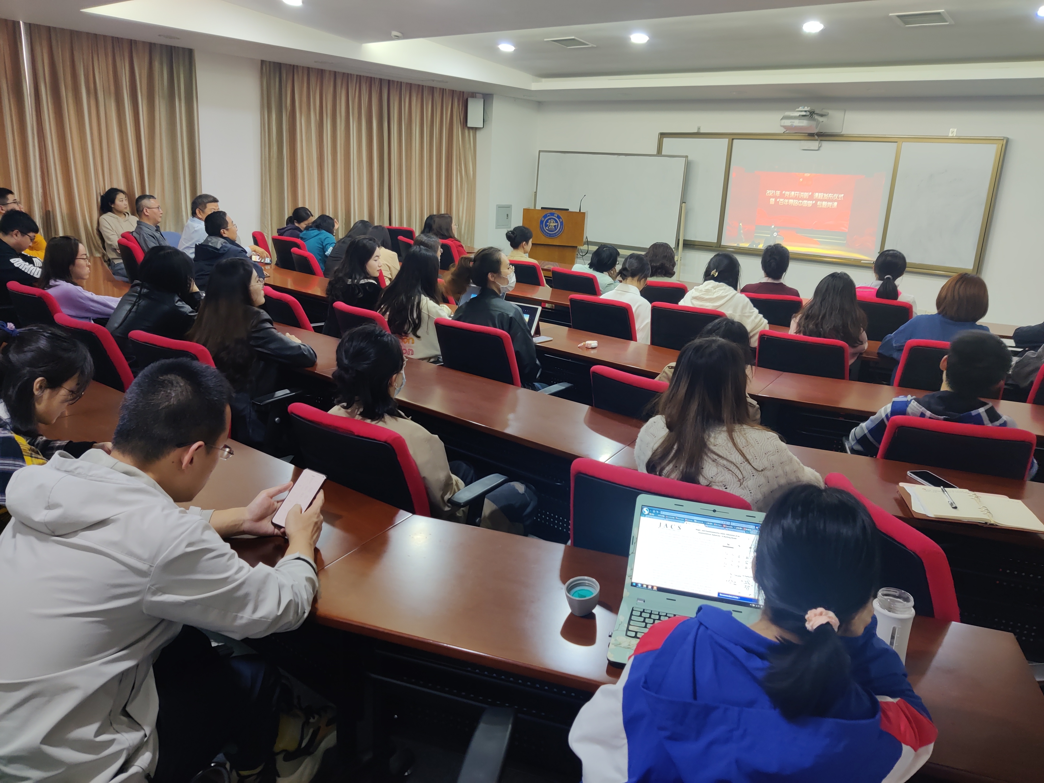 2021年4月23日下午,海角网 党委组织师生党员集中收看2021年“党课开讲啦”活动启动仪式暨“百年寻路中国梦”专题党课,党课以诗音画的形式再现了中国共产党从站起来到富起来再到强起来的奋斗史。海角网 党委书记刘建新,副书记张宝红、叶定剑,副院长邱明丰及师生党员一百三十余人参加活动。