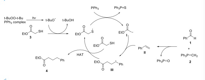串联反应可以通过一步操作实现多个碳碳键的构建,是一种绿色、高效且经济的方法。自由基型的串联反应的设计和实现一直是非常有趣但非常具有挑战性的工作。孙占奎课题组设计并实现了一种可见光诱导的自由基型“Wittig/氢烷基化”串联反应策略。该成果基于课题组以前的工作(Green Chem., 2020, 22,669)。在可见光诱导下,α-巯基取代的羰基硫醇通过脱硫过程形成烷基自由基(I),之后加成到Wittig反应原位生成的烯烃(Ⅱ)上,从而得到延长碳链的自由基中间体(III),之后经过氢原子转移反应得到产物(4)。该方法具有不含金属、条件温和、底物适用范围广、官能团耐受性好等特点。作者进一步把该方法应用于活性天然产物的合成上,作者以醛(51)为原料,通过此串联反应与氢化两个步骤,以34%的总收率得到了天然产物indolizidine 209D。