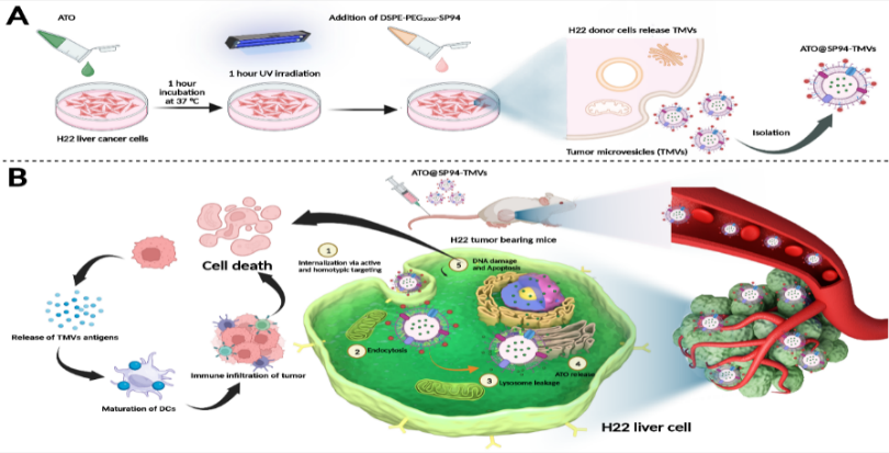 图 1. A)ATO@SP94-TMVs的制备过程;B)具有肿瘤靶向的 TMVs 触发免疫激活机制以及协同增强ATO抗肝癌效果