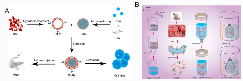 (2)红细胞膜仿生纳米递送系统。采用离子交联法制备负载ATO海藻酸钠纳米颗粒(SANs),再将红细胞膜(RBCM)修饰在其表面,即得到了RBCM载ATO仿生纳米颗粒(RSANs,图2A),可有效减少巨噬细胞捕获,增加肝癌细胞和APL细胞摄取,具有持续释药特征,增强了对肿瘤细胞的杀伤作用,依靠EPR效应被动靶向至肿瘤组织,减轻了ATO对正常细胞和正常组织的毒性,显著地抑制了肝癌皮下移植瘤的生长。采用聚乳酸-乙醇酸共聚物(PLGA)负载 ATO,并通过乳化法制备PLGA-ATO 纳米粒(PANs),可显著提高ATO水溶性,通过超声将RBCM包被在PANs表面,成功制备了RPANs仿生纳米递送系统(图2B)。RPANs能缓慢持续释放药物,降低正常细胞毒性,能有效避免免疫系统的清除。RBCM仿生纳米颗粒为ATO 治疗HCC和APL提供了新的方向。