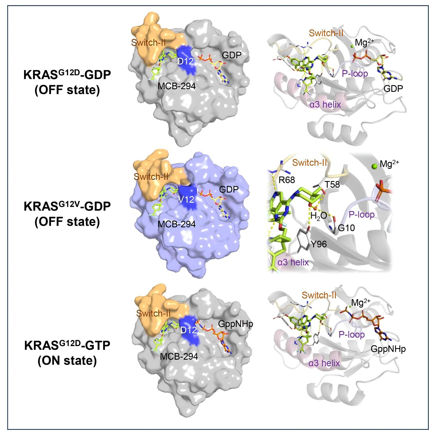 在前期开发的KRASG12D选择性抑制剂Compound 31基础上,研究团队通过结构优化,降低C4位取代基的碱性,从而削弱其对KRAS12位天冬氨酸残基(D12)的依赖;同时引入极性基团,以增强其与KRAS蛋白保守残基的相互作用。基于上述策略,团队设计并合成了一系列具有广谱活性的KRAS抑制剂。其中,MCB-294表现出优异的抗肿瘤活性,能够有效抑制KRAS的核苷酸交换及其下游信号通路的激活。蛋白晶体结构解析显示,MCB-294可同时结合KRAS的活性(ON)与非活性(OFF)构象。其结构中的羟基哌啶基团可通过水分子介导的氢键网络,与P-loop区域的保守残基形成稳定相互作用,高效占据KRASswitch-II变构口袋,从而实现对KRAS的精准靶向。该结合模式不依赖KRAS12位氨基酸的突变类型,赋予其广谱抑制多种KRAS突变体的力。与目前已报道的KRASG12D抑制剂MRTX1133以及仅靶向KRAS非活化(OFF)构象的泛KRAS抑制剂BI-2865相比,MCB-294能在更低有效浓度下抑制肿瘤细胞增殖及KRAS活性。