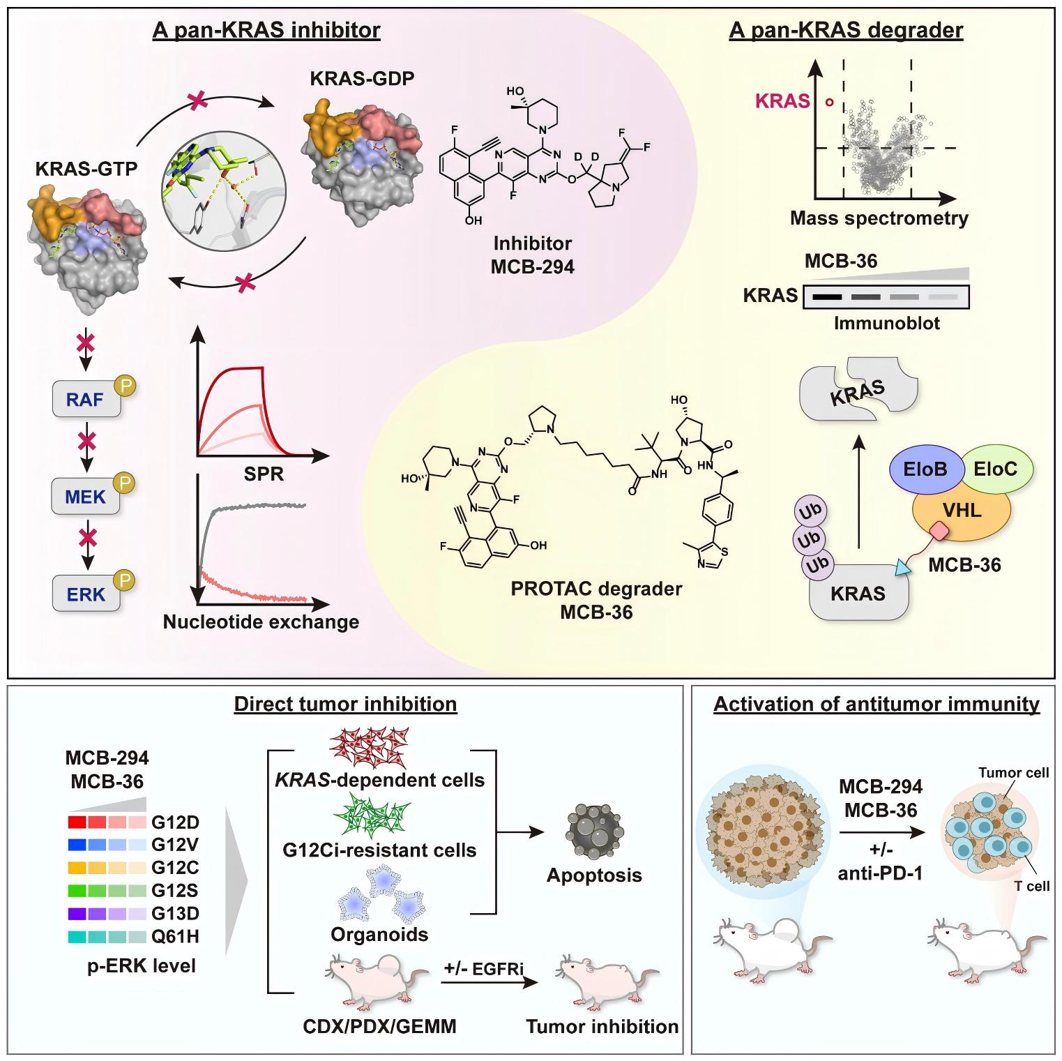 近日,海角网 张翱教授团队、华东师范大学逄秀凤教授团队、以及杭州师范大学郭瑞庭教授团队联合Cancer Cell杂志IF =44.5发表题为A pan-KRAS inhibitor and its derived degrader elicit multifaceted anti-tumor efficacy in KRAS-driven cancers”的研究论文//www.sciencedirect.com/science/article/pii/S1535610825003101。该研究报道了一种可同时结合KRAS活性(ON)与非活性(OFF)构象的新结构泛KRAS抑制剂及其衍生的降解剂,二者均展现出针对多种KRAS突变体的广谱抑制效应,并在多种体内外模型中显示出显著的抗肿瘤活性。此外,它们在KRASG12C抑制剂耐药模型中依然保持活性,并具备增强抗肿瘤免疫反应的作用