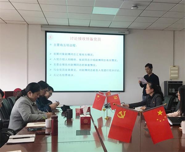 会议在支部书记李伟同志的主持下进行。第一项内容是讨论接收赵博同志为预备党员的事宜。首先由赵博同志上台做简短的发言,汇报自递交入党申请书以来,思想、学习、工作以及生活上的感悟、收获、态度及表现等情况,并表明了自己已经做好接受党的考查的准备。然后由赵博同志的入党介绍人分别对其作出评价,并表达了是否建议其接收为预备党员的意见。支部的其他党员同志也分别对是否接收赵博同志为预备党员发表了意见,和对赵博同志的建议。最后由支部各位正式党员进行不记名投票,投票结果为全票通过,一致同意接收赵博同志为预备党员。