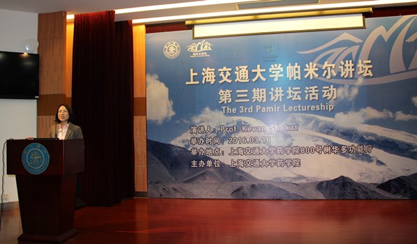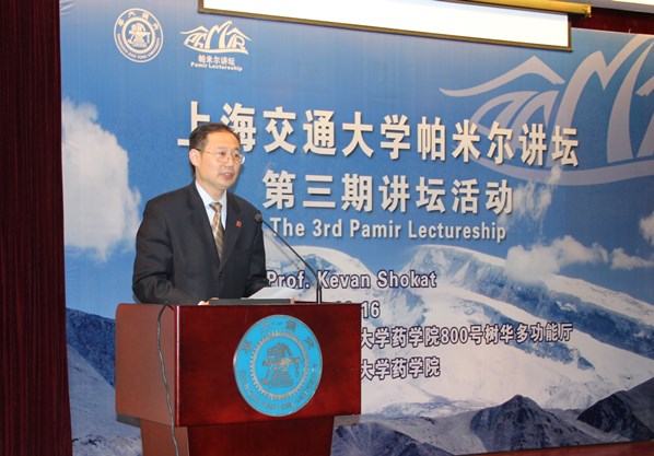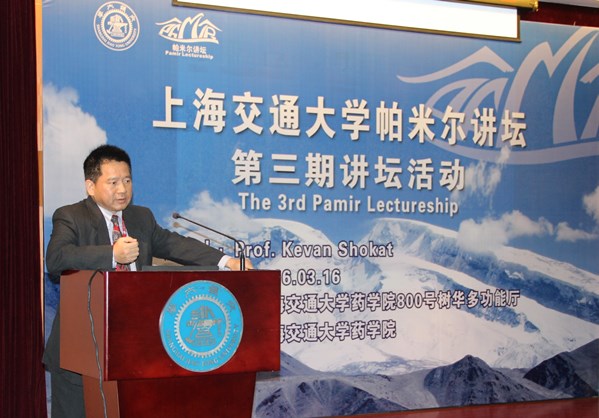 朱建伟代表海角网 致辞。他首先感谢Shokat教授应邀不远万里出席第三期帕米尔药学讲坛活动,欢迎各位嘉宾和师生的光临,并对于随后的学术报告和学生座谈会表示期待。他说,帕米尔药学讲坛在前两期成功举办的基础上,不断提升品质,已经成为了海角网 的一张名片。最后,他对组委会的辛勤工作表示感谢,他相信,本期帕米尔讲坛会成为一次精彩、难忘的学术盛会。