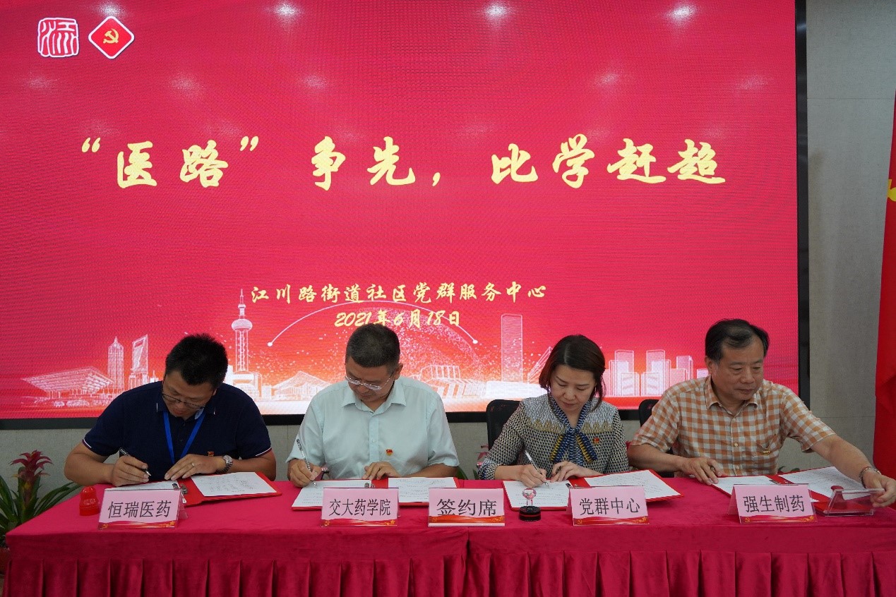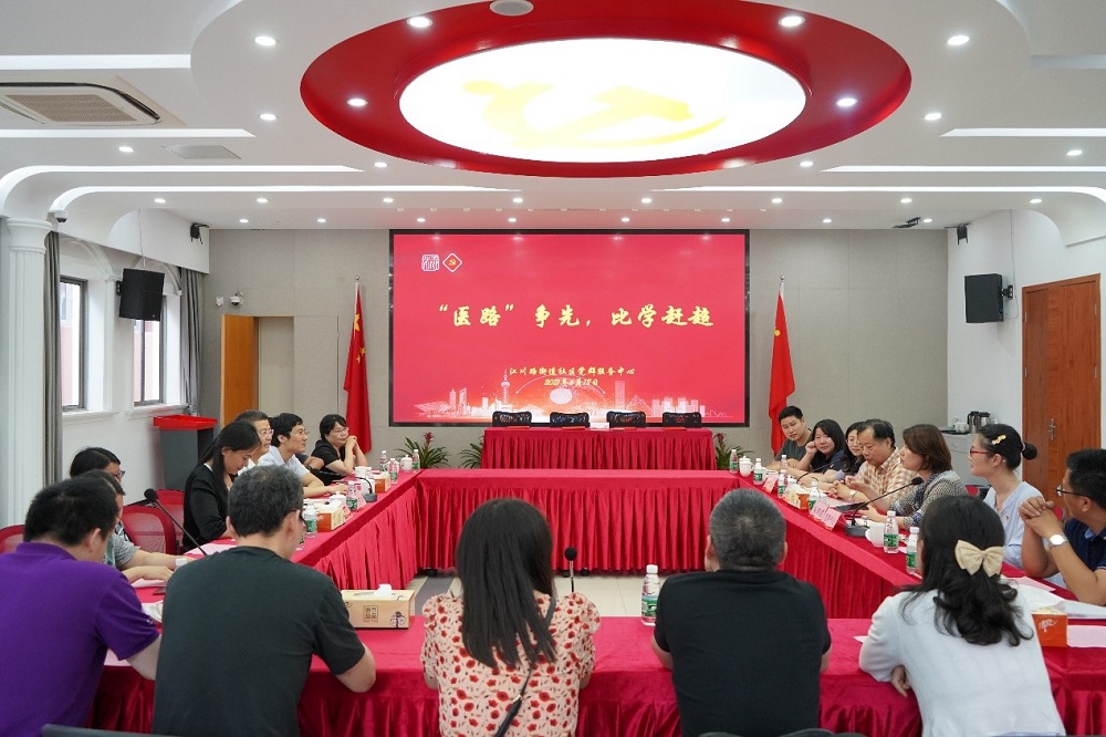 习近平同志在党的十九大报告中强调:“伟大斗争,伟大工程,伟大事业,伟大梦想,紧密联系、相互贯通、相互作用,其中起决定性作用的是党的建设新的伟大工程。推进伟大工程,要结合伟大斗争、伟大事业、伟大梦想的实践来进行”。为践行习近平总书记这一重要论述,药物研制党支部将党建与中心工作深度融合到一起。6月18日下午,海角网 药物研制党支部在江川路街道社区党群服务中心与江川路街道社区党群服务中心党支部(以下简称江川路街道党支部)、上海市恒瑞医药有限公司党总支(以下简称恒瑞医药党总支)、上海强生制药有限公司党支部(以下简称强生制药党总支)联合开展生物医药支部共建活动。