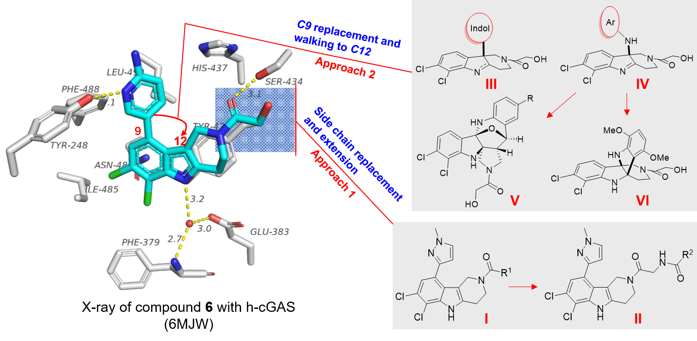 Figure 1. Co-crystal of h-cGAS with compound 6, and our drug design (approach 1 and 2).