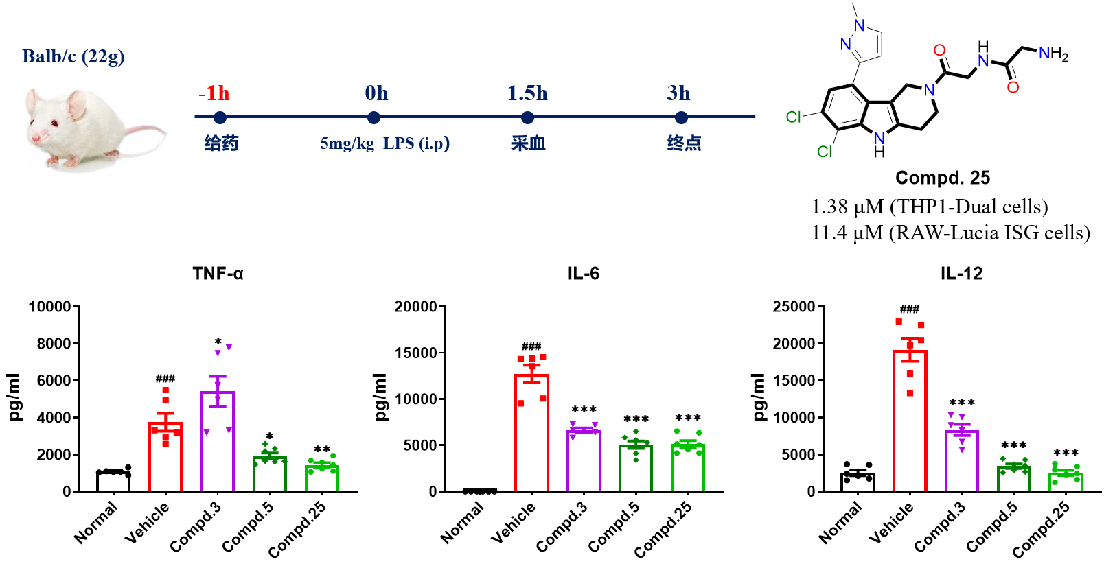 该团队针对现有绝大多数cGAS抑制剂细胞活性弱等不足,基于cGAS的结构特点,采用生物电子等排、侧链延长等药化策略先后合成两个系列小分子抑制剂I和II;并运用骨架迁移策略,改变C9位取代芳基并将其迁移到C12位,合成系列III和IV;再在IV基础上进一步分子内重排或环化,分别得到系列V和VI (Figure 1)。对新化合物进行人源THP1-Dual细胞和鼠源RAW-Lucia ISG细胞中对dsDNA刺激的cGAS信号通路抑制活性进行测试,代表性化合物进一步通过WB和qRT-PCR检测,确证对cGAS–STING通路具有较好的抑制作用。其中,新化合物25不仅具有显著改善的水溶性(HCl盐:27.65 mg/mL),还具有较好的cGAS抑制活性(IC50 : 1.38 μM for THP1-Dual cells;11.4 μM for RAW-Lucia ISG cells)。机制研究发现,新化合物在THP1-Dual细胞中对cGAS具有直接靶向作用。在LPS诱导的急性炎症小鼠模型上,腹腔注射化合物25显著下降小鼠血清中的炎性细胞因子TNF-α、IL-6、IL-12的水平,显示出良好的抗炎效果(Figure 2),具有治疗炎症和自身免疫性疾病的潜力。