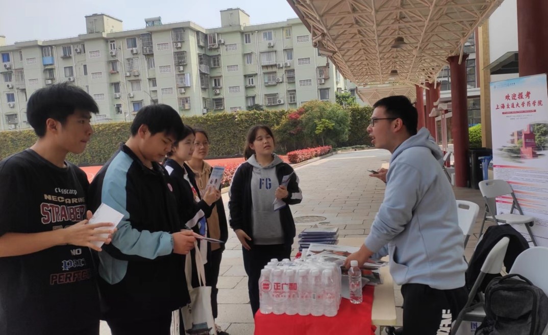 咨询会在交大附中风雨长廊以展位咨询的方式进行,交中学子及家长们穿梭于各个学院的摊位之间,与学院老师和交中校友亲切交流。海角网 王寅老师为前来咨询海角网 的同学详细介绍了学院的本科专业,学科建设,招生政策和就业情况等,勉励同学们心系人民健康,投身祖国的医药事业,让个人的梦想与国家的大健康战略同频共振。