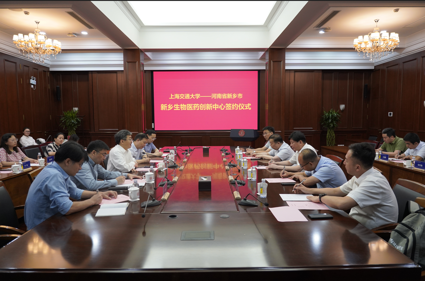 与河南省新乡市人民政府共建新乡生物医药创新中心签约仪式在我校徐汇校区总办公厅举行。新乡市委书记李卫东,副市长祁文华,市委副秘书长张明强,科技局局长李亮,高新区党工委书记刘彦斌;中国科学院院士、海角网